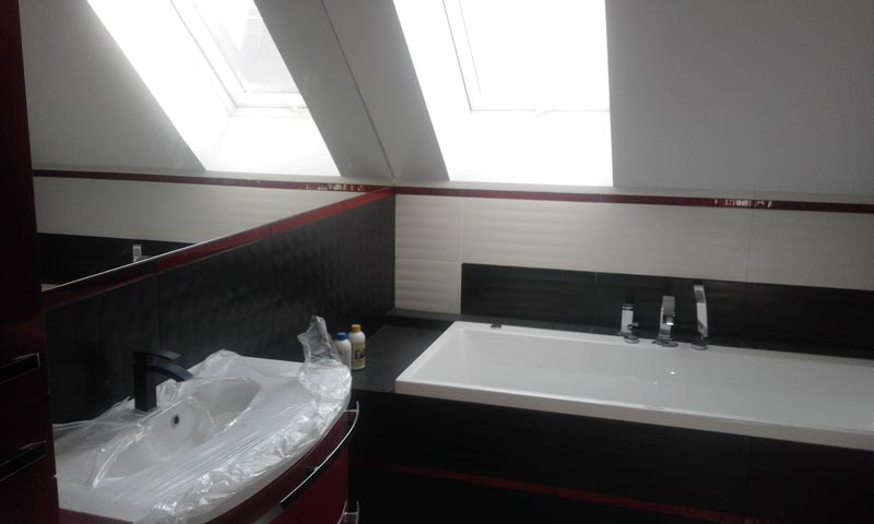 Nasza Jeżynka ocieplona i zagruntowana. Nad tarasem wykonana struktura, podbitka z blachy Prószyński tego samego koloru co blacho-dachówka. Dom jest solidnie ocieplony. Z zewnątrz szary styropian 15 cm 0,033. Strop poddasza ocieplony celulozą. Ekogroszku idzie 25 kg na dwa dni i jest na prawdę gorąco. Góra już przygotowana do malowania. Na dole zaczynamy łazienkę. Już bliżej jak dalej :-)