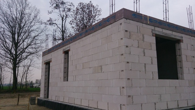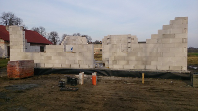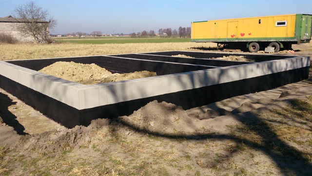 1ZDJĘCIE: ZALANE JUŻ SĄ FUNDAMENTY, WYMUROWANE BLOCZKAMI, OCIEPLONE I POMALOWANE